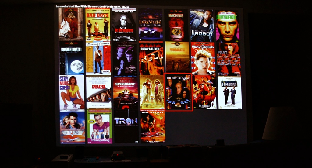 DVDs are stored on an external hard drive connected to the PC. This allows me to switch movies from the couch via remote control. I wrote a custom application in Processing to load DVD cover images stored in the directories with the DVD ISO files.